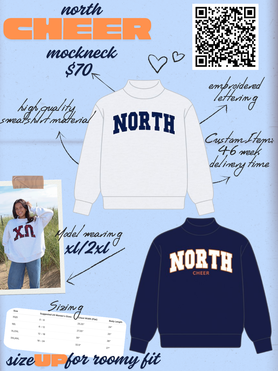 Option 2: NORTH CHEER (navy mockneck, white lettering)